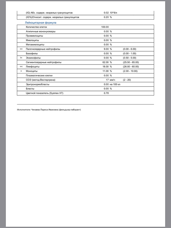 В анализе крови имеется не выраженный нейтрофильный лейкоцитоз, что свидетельствует о воспалительном процессе, предположительно, бактериального характера.