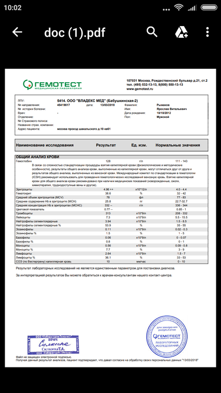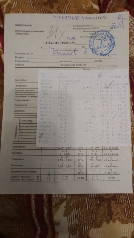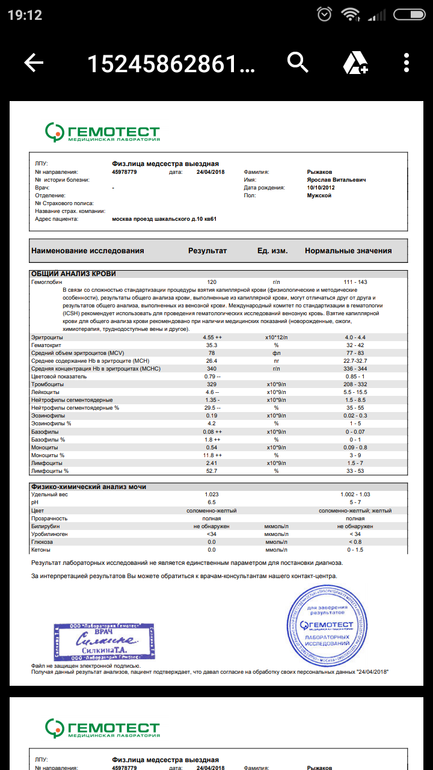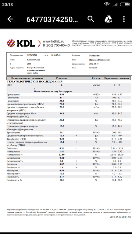Здравствуйте! Я к вам за мнением. Расскажу по порядку. С начала марта у Ярика появилась температура 36.8-37.5, на нёбе были кровоподтеки. Сдали кровь (прилагаю, от 13 марта). Педиатр смотрел - ничего не нашёл, сказал в анализах вялотекущая инфекция. Назначил пересдать кровь и сдать мочу именно в поликлинике (прилагаю, от 19.03).Фото горла также прилагаю (где не пятна, а излияния. Вопрос: что видите вы по анализам с учетом симптомов?