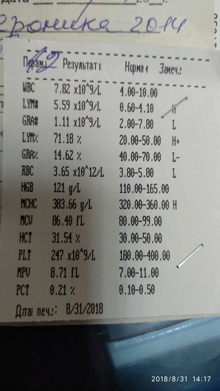 Первый - общий анализ мочи. Никаких отклонений от нормы в нем нет. Второй - общий анализ крови. В нем есть небольшие изменения в лейкоцитарной формуле: повышены лимфоциты и снижены гранулоциты. Такая ситуация характерна для вирусной инфекции (детские инфекции, ОРВИ) или вскоре после нее. Но, нужно заметить, такие изменения часто встречаются и у совершенно здоровых детей. Переживать по этому поводу и что-либо лечить не нужно.