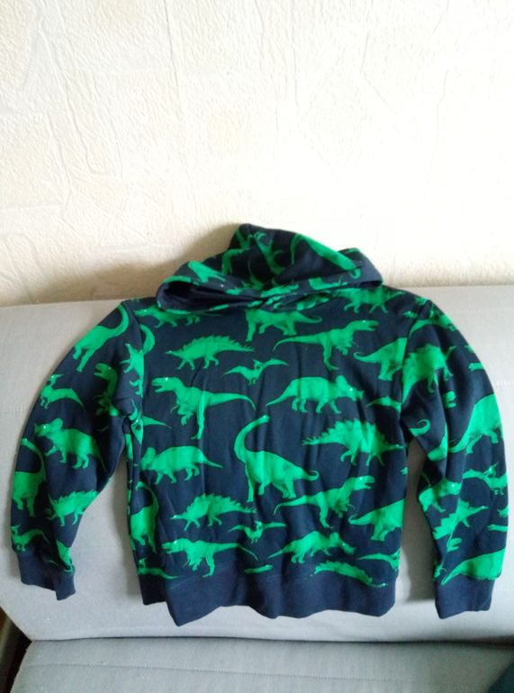 Мы вместе с сыном являемся поклонниками Джулии Дональдсон, в особенности Груффало, поэтому, когда едущие в гости, немецкие друзья спросили чего нам привезти - я быстренько пошуршала по их немецким сайтам и нашла, чего хотелось. Сын очень доволен, всем рассказывает, что это Груффало и у нас есть книжка про него. Взяла нам немного на вырост 98-104 размер. Ходили в детскую библиотеку, произвели там фурор среди библиотекарей и детей своим нарядом :)