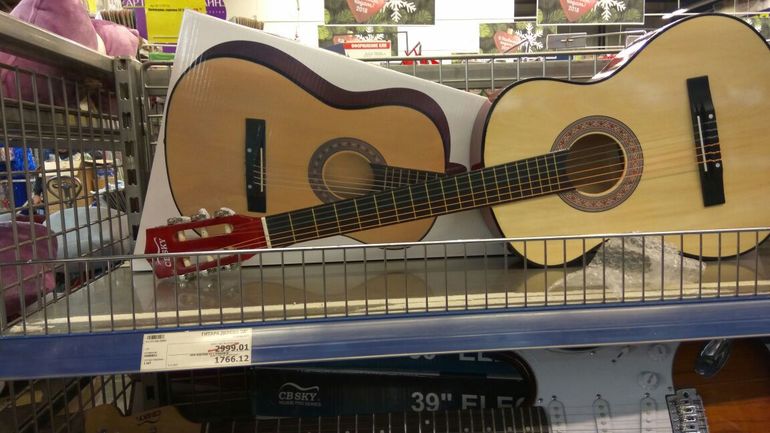 Старший сын (12 лет) попросил на Новый год. настоящую гитару. Промониторила рынок и приготовилась уже было купит гитару. как минимум за 3000 рублей. И как же я счастлива. что попала сегодня в магазин Метро. Купила гитару за 882 рубля (первая цена 2999 руб) .Вдруг кому-то тоже будет актуально.
