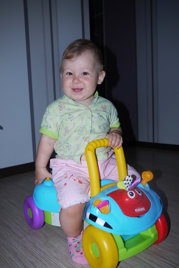 у нас вот такая каталка-ходунки, уже около месяца Ариша с ней возится..конечно сама ещё не может на ней кататься, думаю что как раз к годику она это освоит. Ну а пока что ей интересно толкать её, также на каталке есть всякие погремухи, спереди бардачок, куда мы прячем разные детальки. В общем каждый день ребёнок проявляет интерес к этой игрушке. А на годик мы хотим заказать бабушкам-дедушкам для дочки электромобиль. Я думаю что следующим летом на прогулках он будет очень интересен нашим малышам. Я замечала как дети на улице не равнодушны к таким гаджетам и готовы на них часами кататься. Ариша в гостях у братика уже опробовала электро мотоцикл - ребёнок был в восторге