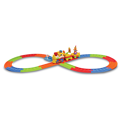 Восьмёркой, как на картинке...Круглую, овальную...Паровоз едет по дороге и просто по полу, и по паласу. Может ехать сам (на батарейках), можно рукой везти. Играет песенки, издаёт характерный звук паровоза...Мы довольны)))
