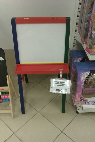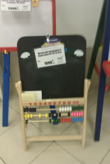 такие вот 2 доски, одна двухсторонняя, для мелков и фломастеров-магнитов, вторая односторонняя только для мелков но внизу зато есть счеты. цену по-моему на фотке видно.