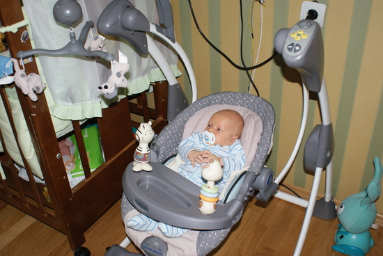 И у нас качельки Грако, это мое спасение, у них 3 положения спинки, мы в них где-то с 1,5 мес. под спинку подкладывала штучку от автокресла) Нам они очень нравятся, до сих пор катаемся, хоть время естьи приготовить и полы помыть и поесть. Когда ухожу обязательно столик пристегиваю, а так можно и без него сидеть.