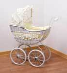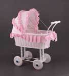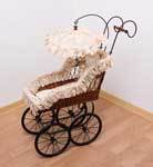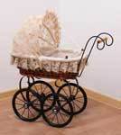 Предлагаю порадовать наших девочек ретро колясками для кукол. Плетеная кукольная коляска непременно будет роскошным подарком ребенку, а также шикарным предметом интерьера. Люлька сделана из плетеной лозы ивы. Красивый кованый каркас с деревянной ручкой. Большие колеса с резиновыми вставками придают коляске плавный ход. Капюшон у коляски можно опустить. Внутри коляска отделана тканью из натурального хлопка. Кружева выполнены в ручную.