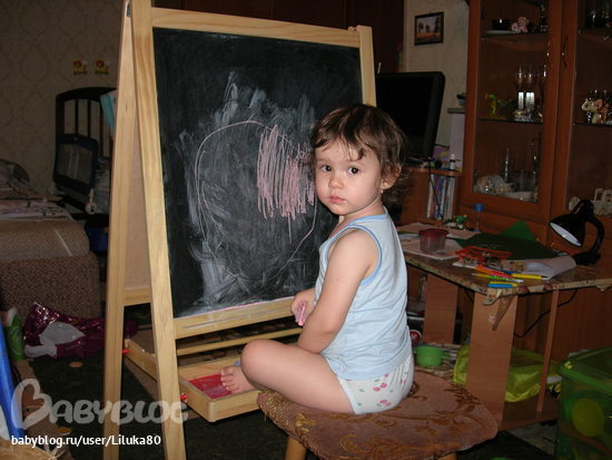 Я дочке на НГ дарила в год и 8 мес. - очень ей нравится.... сейчас уже вдвоем на нем мелками рисуют, только следить надо, что бы мелкий не перешел на другие поверхности... у нас икеевский..