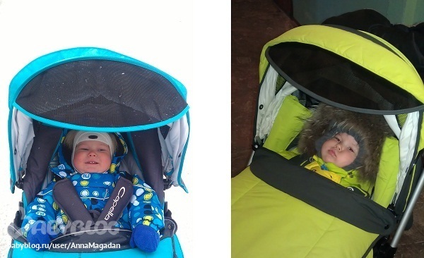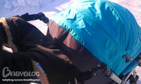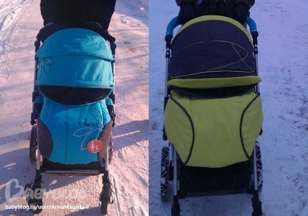Вернемся к муфте. В отличии от полностью закрывающей ребенка жетемовской, капелловская закрывает только ножки. К слову о внутренних размерах коляски. Несмотря на то, что заявленные производителем параметры одинаковые, капелла как то мельче. Слева ( в жетеме) ребенок одет в овчинный комбез 86го размера ( еще великоват немного, но велик-не мал), причем сидит он довольно свободно в коляске. Справа же мы в мембранном комбезе 80го размера, который нам тютелька в тютельку и сидеть как бы не то, что тесно, но не настолько просторно, как в жетемке. Хотя повторюсь-заявленные параметры производителем-одинаковые. Предвидя фразы типа «ребенок мог подрасти» сразу оговорюсь…разница в фото –неделя. И подрасти настолько, что бы коляска стала тесновата ребенок просто не мог.