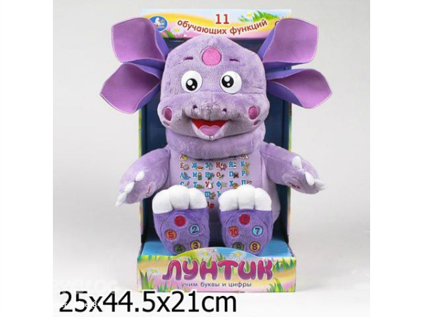 Мне кажется у лунтика, у нас мишка,у него на лапке кнопочки, ручку зажимать поцелуйчик издает,а на животике по кругу, мама папа деушка бабаушка,дядя, тетя, и песенки разные, Соня с полугода им играется и до сих пор очень нравится!!! размером где то сантиметров 30 в длину!