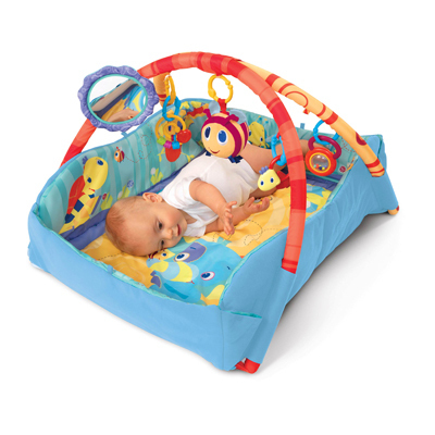 Коврик развивающий обязательно. Только советую с бортиками для безопасности ребёнка. Рекомендую фирму Bright Starts, у них есть прекрасные развивающие коврики! Мобиль на кроватку тоже нужен, например такой этой же фирмы. Обязательно игрушки для коляски. Ну и естественно, погремушки. Можно купить сразу с прорезывателями для зубок, позже такие штуки обязательно понадобятся)) Такой вот мини- комплект у вас должен быть)