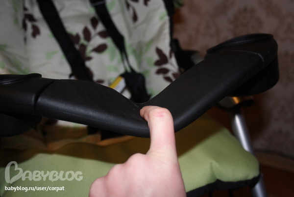 - Что касается самого бампера, он из мягкого (для складывания коляски), но достаточно прочного пластика с подстаканником и еще какой-то выемкой :).