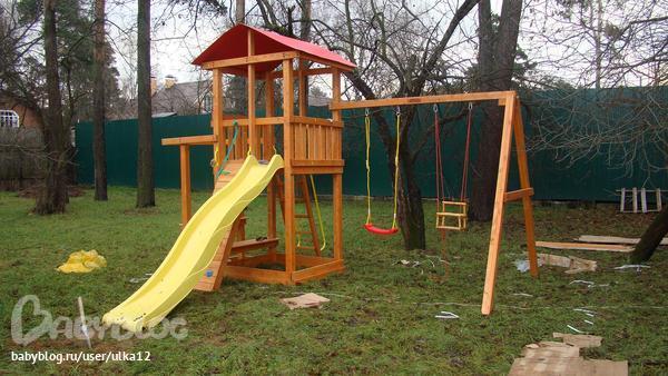 это фото еще в осенью, в моменты сборки. сейчас и вторые качели тоже со спинкой)