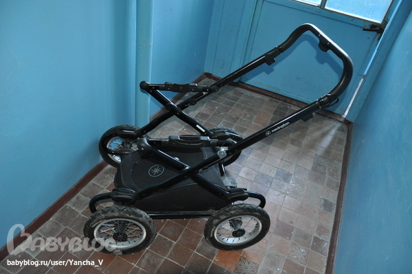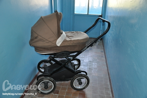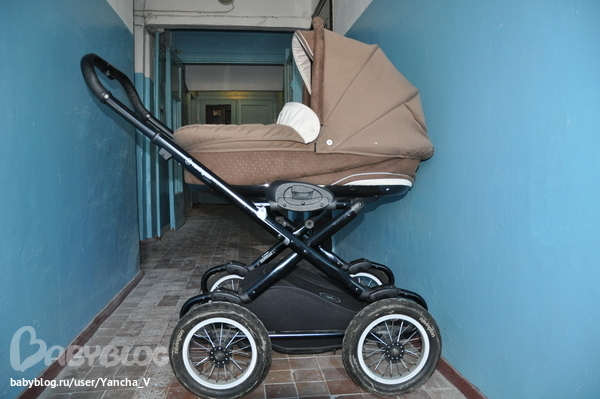 Но в эксплуатации коляска шикарная - люлька очень хорошая, просторная, непродуваемая. Легко снимается с шасси. У нас малыш в ней (без колес) на балконе часто спит. Как-то неделю жили у родителей, использовали люльку вместо кроватки. Хотя повторюсь - габаритная. Коляску вместе с ребенком вы не поднимите - т.е., если надо по ступенькам пронести - только вдвоем. Но я если без мужа гуляю - прохожих прошу. Зато едет она очень мягко, малыша не трясет. Качается как колыбелька одним пальцем.