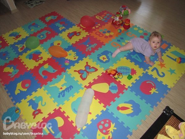 Развивающие коврикиСоня еще с 4,5 месяцев начала передвигаться и держать ее на кровати было достаточно опасно. Поэтому мы положили одеяло на пол, но у этого хода было много минусов: постоянно скомкивалось, перемещалось, часто стирать надо было и т.д. Пол у нас ламинат, то есть скользко и холодно. Тогда я увидела в интернете замечательные коврики-пазлы. Они по идее от 3 лет, так как есть мелкие детали. Но я решила, что Соня на этом коврике с начала поползает. Когда научится выковыривать эти детальки, она уже будет ползать активнее и по всей квартире, тогда и коврик не нужен будет и я уберу все пазлы с мелкими деталями. Ну а когда подрастет, будем заниматься, собирать эти пазлы.
