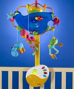 У нас мобиль TOMY с винни-пухом, это наше все!!! Месяцев с 2 начал активно интересоваться, с 3-х мог по полчаса зависать под музыку. А сейчас ловит ручками игрушки и пинает их ногами, бандит...) Единственное, чего мне не хватает в нем - пульта...