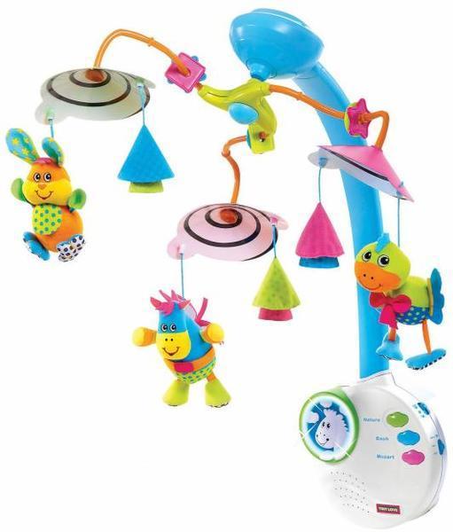 Тини Лав Классический мобиль.Интересен стал уже ближе к месяцу (недель с трех наверное где-то) и до 5 мес. был хитом номер 1, пока дочка не стала на нем подтягиваться)) Супер-мобиль, очень продуманный. Дочка зависала под него мин. на 30-40!! Это было просто настоящие спасение мое)) А главное, доча часто засыпала под него)) Один из немногих мобилей, у которого есть черно-белые детали, которые больше всего интересны самым масеньким. В общем, рекомендую.