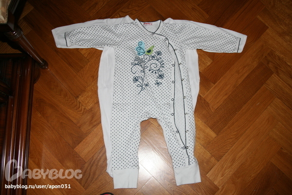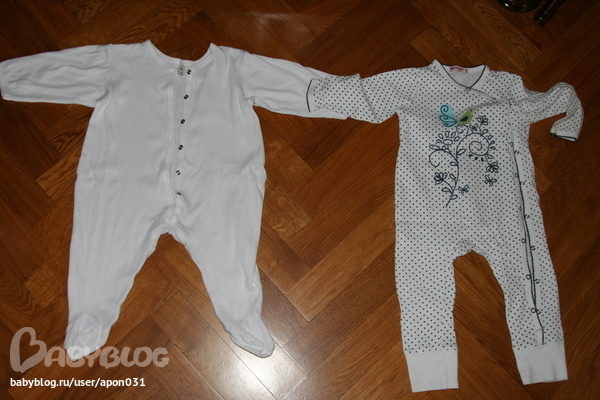 вот фотки в сравнении с другой фирмой, причем комбез в горошек фигуру ребенка не облигает - сидит так, как надо, чуть с запасом. Белый комбинезон после стирки и утюжки, т.е. конечно немного сжался:)
