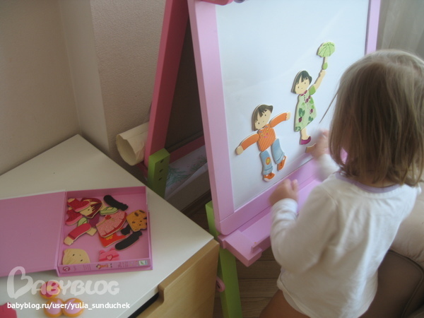Дочка на ней постоянно играет - и рисует - и красками на рулоне, раскручивая его, и мелками, и фломиками на магнитной стороне - и еще магнитиками очень любит играть - это у нас просто суперхит!!! постоянно стоит и складывает...