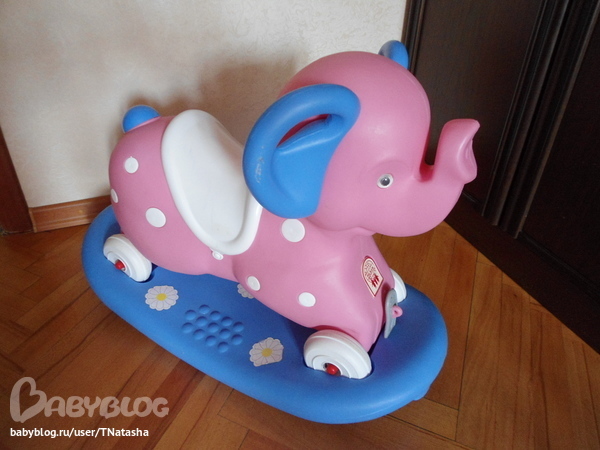 Достался в наследство так сказать))) Страшненький по моему мнению, достаточно крупный, НО НЕВЕРОЯТНО УДОБНЫЙ оказался для нашего мальчика. На нем он любит кататься, хорошо раскачивается, но устойчивый, не перевернется, да и на колесиках поездить можно (нам правда еще рановато, плохо достает до пола ножками). За ушки удобно держаться. Этого слоняку я крестнице года 4 назад покупала, где уже не помню, думаю сего чуда уже не делают, но наверняка на похожей платформе есть.
