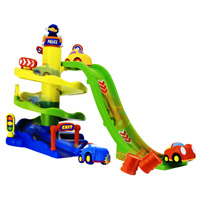 Производителя не знаю, нашла картинку на яндексе, нравится, что ничего лишнего-винтовой спуск и горка, машинки видимо в комплекте, яркий пластик. Кто знает производителя-буду благодарна.