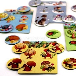 В набор входит: 5 игровых полей и 30 фишек с изображениями различных животных.