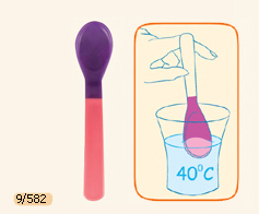 на картинке же нарисовано 40 градусов предел. помыли значит в горячей воде сработал индикатор температуры. добавляется чтобы ребенок не обжегся. хотя вы так описываете, что очень воняет. у нас немного желтели силиконовые камполовские ложки, если в очень горячей воде помыть. но не воняли точно. нас в институте учили, что если пластик резина или силикон издает запах то это некачественный продукт. и никаких лабораторий не нужно, даже качественный линолеум не должен пахнуть