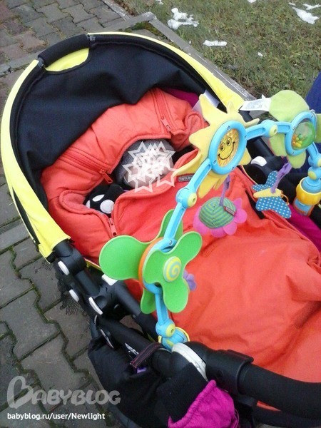 мешочек(конверт) в люльке, внутри малыш в слипе и всё! + пледиком прикрыт. мешок теплющий. на улице был 0. любит на игрушки глядеть: