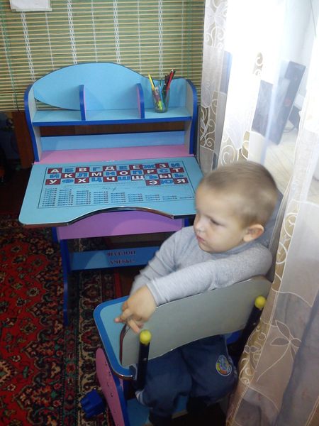 У нас парта, но малой почти не сидит за ней. Не творческий он у меня, ему б повиснуть, крышкой от парты постучать, рисует редко. По качеству слабенькая, или мой такой шалопай, крышку уже с одной стороны оторвал, и отклеилось пара боковых полосок синеньких.Она у нас почти год.К ш