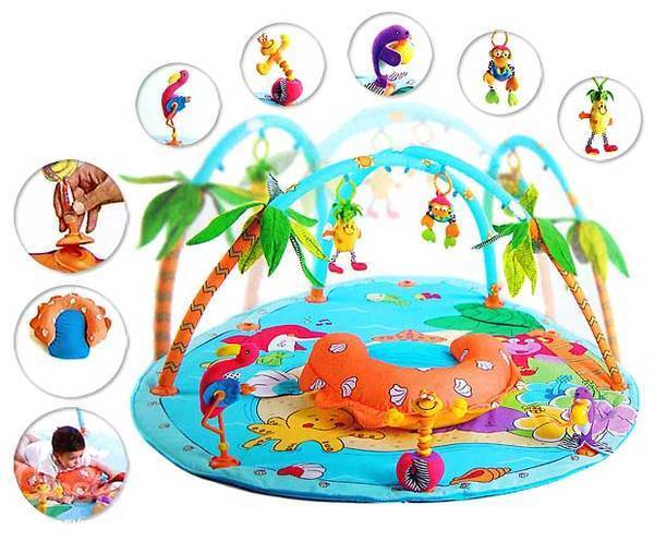 2. Подарили нам на рождение доченьки вот такой коврик TinyLove Тропический остров. Играем на нем с месяца. Коврик достаточно большой, яркий, но не слишком (для меня это огромный +) Как и все сначала лежали, на все смотрели, потом улыбались девочке в зеркале:) начали с ней агукать! потом игрушки подвесные дергали (фаворит ананасик), с шуршалками играли. Теперь на нем сидим с другими игрушками играем, иногда замечаем прикрученные фигурки на коврике. Вещь очень качественная и хорошая, мое мнение нужная. Малышке и мне нравится :) Советую