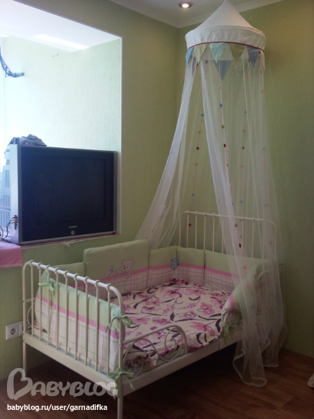 Выбирала только по картинке в интернете,спасибо ББ!!!У нас Икеи нет(и вобще ничего приличного)но это меня не остановило)больше всего переживала чтобы матрас был не слишком мягким,продавцы в инет магазине имели очень пространное(никакое)представление о товаре..но я рискнула ииииииииии не пожалела ни разу!Кровать превзошла все мои ожидания,она и красивая и удобная( довольно редкое сочетание).Пока не включили отопление, приспособила бортик Feretti, от маленькой кроватки,в которой мы не разу не спали..Здесь доченька спит с удовольствием,с первого дня.Фото с телефона(На телевизор и прочий недоинтерьер, не смотреть)