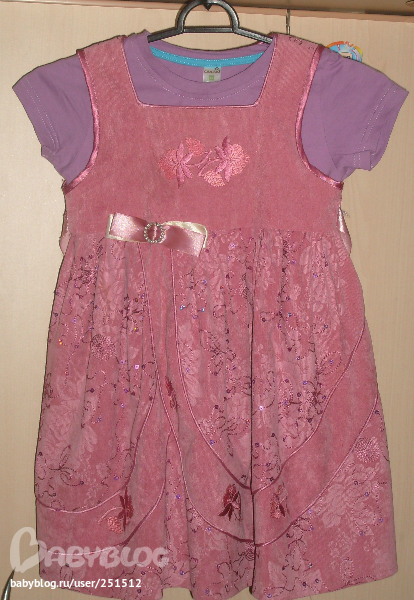 мы носим похожий сарафан (тоже рзовый) с белой водолазкой(когда прохлпднее - с белым гольфиком), белыми колготочками и можно наверх болеро(но у нас нет)
