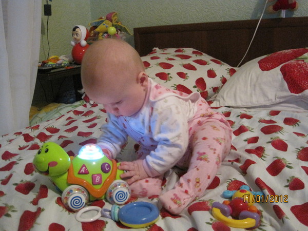 нам подарили черепаху на 6 мес - она светится и мелодии разные - моя до сих пор с ней играет - очень ей нравится