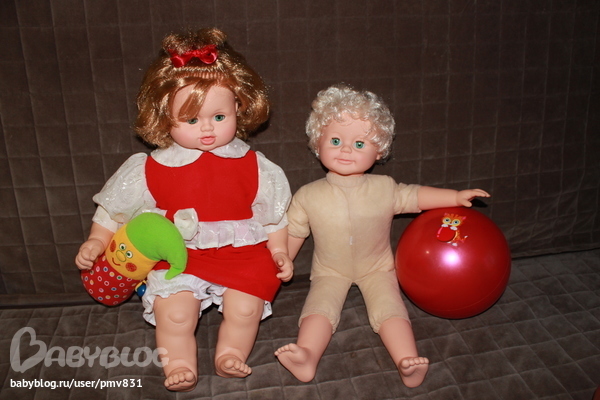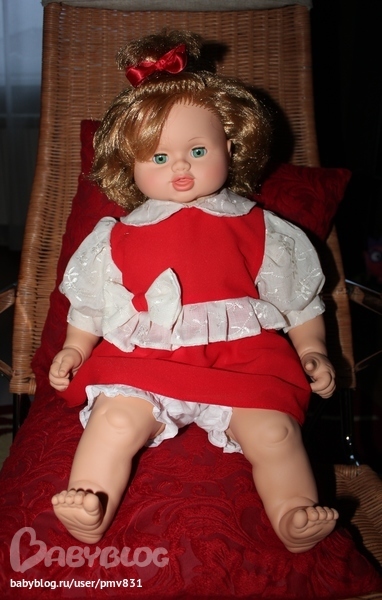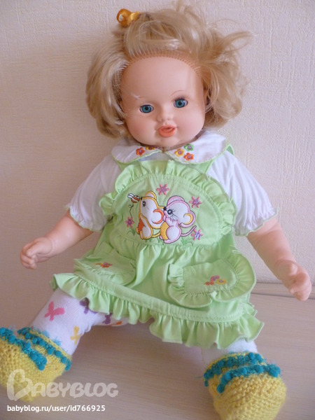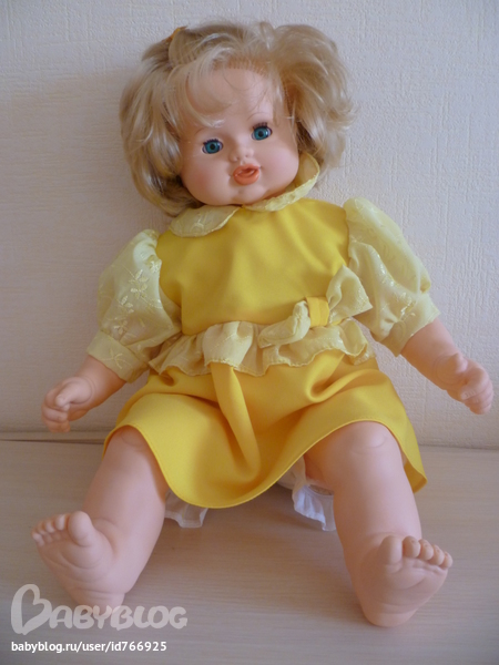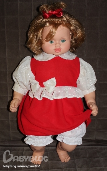ИгрушкиПодарочек доче к Новому году. Я от нее пищу весь день))) если Анечка этакий большеголовый правдоподобный младенец, то Яночка - девочка "повзрослее", с пышными волосами, в красивом платьице. С ней хочется не няньчиться, а наряжать, делать ей всякие прически, усаживать на стул пить чай... Яночка говорит таким чуть капризным голоском несколько коротких фраз ("мааа-ма!", "давай поиграем", "почитай мне книжку", "хочу есть", "хочу спать"), тоже с различным выражением. Говорящее устройство в кармашке на груди, как у Егорыча. тело мягконабивное, резиновые конечности, ножки полусогнуты как у Анечки-младенца. Под нежным платьем (ткань похожа на жоржет) на Яночке пышные хэбэшные панталончики, а вот ножки босые почему-то.