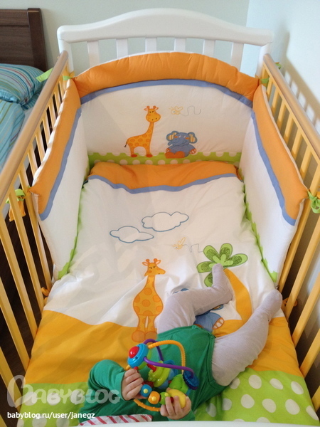 Купили сразу матрас тоже фирмы Pali бамбуковый и постельное белье в тему к кроватке ( дорогое конечно, долго решалась, но купила:)). В наборе белья наволочка, бортики и одеяло с пододеяльником.