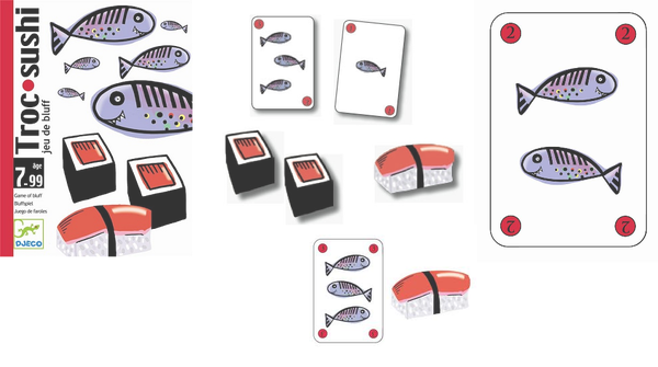 Правила игры: колода карт кладется в центре стола, лицевой стороной вниз. Самый младший игрок (A) начинает игру. Он берет 3 первые карты из колоды, смотрит их, подсчитывает количество рыбок, и объявляет число, меньшее или равное 9. В зависимости от выбранной стратегии, он может говорить правду или блефовать. Дальше возможны 2 варианта: - следующий игрок (B) верит игроку A и берет себе его карты. Игрок B берет одну из этих карт, кладет ее рядом с колодой, лицевой стороной вниз, а вместо нее берет себе первую карту колоды. Затем он объявляет количество рыбок, большее, чем то, которое объявил игрок A, и по-прежнему меньшее или равное 9. Если следующий игрок (C) верит ему, то игрок B отдает ему 3 карты и берет себе суши-рулетик. - следующий игрок (B) не верит игроку A. Он отказывается брать его карты. Если игрок A говорил правду, то он показывает карты, кладет их в самый низ колоды и берет себе 1 суши-рулетик. Игрок B пропускает ход. Если игрок A блефовал, то он кладет свои карты в самый низ колоды, не показывая их, и не берет суши-рулетика. Тогда игрок B, в свою очередь, берет 3 карты из колоды, и так далее. Примечание. Если игрок объявляет число "9" и при этом не блефует, то он выигрывает 2 суши-рулетика. Когда у игрока набирается 5 суши-рулетиков, он меняет их на один суши-пальчик. В зависимости от того, каким временем располагают игроки, они могут договориться, что игра заканчивается, как только один из игроков соберет 1 или 2 суши-пальчика (то есть 10 суши-рулетиков).