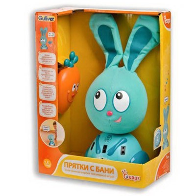 Ребенок надевает морковку на руку и прячется. Кролик закрывает глаза ушами (&"Ушки вниз!&"), считает до 10, открывает глаза &"Ушки вверх!&" и ищет малыша. Встречая на своем пути препятствия, Бани обходит их. Когда кролик приближается к своей цели, он говорит &"Горячо&", удаляется - &"Холодно&". Во время поиска он разговаривает, просит помочь ему, похлопать в ладоши или пошуметь. Радиус действия морковки - не более 4 м. Максимальная продолжительность одной игры - 5 минут. Есть регулятор громкости звука. После игры кролик автоматически выключается. Кролик работает от четырех батареек АА (установлены), морковка - от трех ААА (в комплект не входят). Размер упаковки: 38 х 27 х 15 с