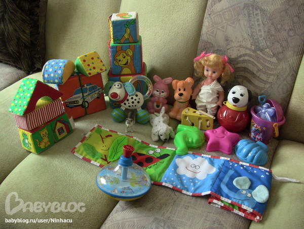 Кубики-мякиши, строим башни. Собаки всех мастей... На кукле учим анатомию. Игрушки для песочницы популярны даже дома. Шнуровка еще не идет, но в восторге, когда я шнурую - мышка бегает, сыр ест. Юлу пытается заводить, но пока никак не научится отпускать после того, как завел. И почему-то любит до сих пор совсем малышачью тряпочную книгу-подвеску.