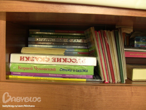 И наши книги (с перекосом по фазе, простите фотографа). Еще столько же в другой комнате. Сказки пока слушать не желаем. Любим ШСГ и картонные книжки, особенно про транспорт.