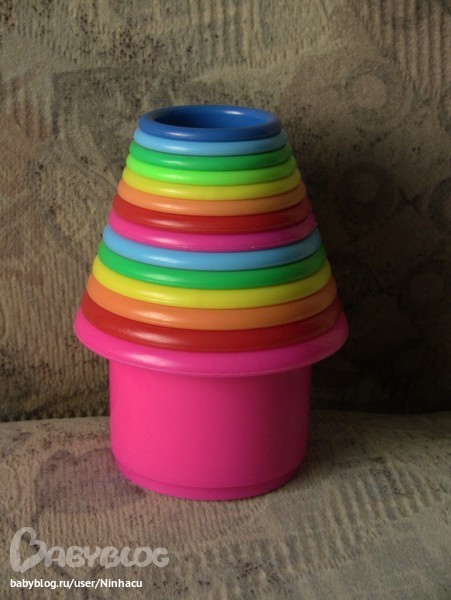 Ой, еще раз стаканчики? Ну, пусть. Пирамидки собирает. Яйца раскидывает и закрывает скорлупками как попало. На пианино включает режим с музыкой, а не с животными, и давай танцевать. На ксилофоне звякает. Чашки расставляет по блюдцам и разливает из чайника "чай". Лабиринт пока совсем никак, убран на шкаф. А вот пластмассовые фрукты и овощи - любовь наша. Играть с ними, купаться с ними, есть с ними...