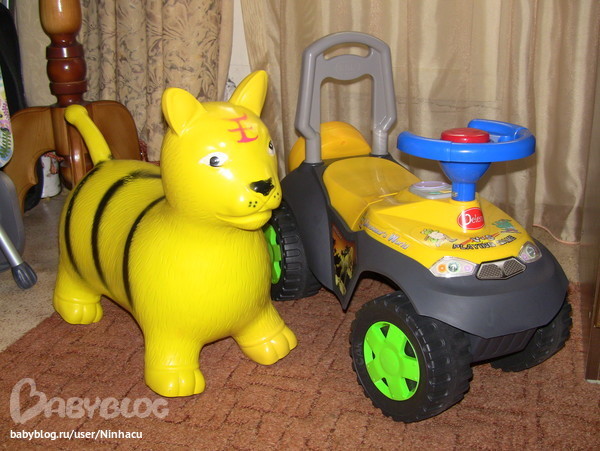 Крупногабарит. На прыгуне не только прыгаем, но еще всяко валяемся, а также целуем тигра в нос и грызем за хвост. На толокаре буквально на прошлой неделе начал отталкиваться ногами не только назад, но и вперед. Рулить пока не соображает.