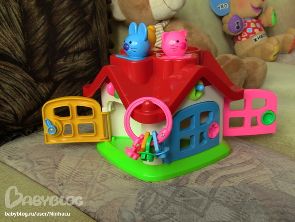Еще более знаменитый ковчег. Играется и в хвост, и в гриву. Где какой зверь, покажи, как он говорит, музыку включи, а где петушок спрятался... Баран и свинья у нас летающие. Кидать их удобно. Пытается сажать зверей, тех, что на нижней палубе, даже получается.