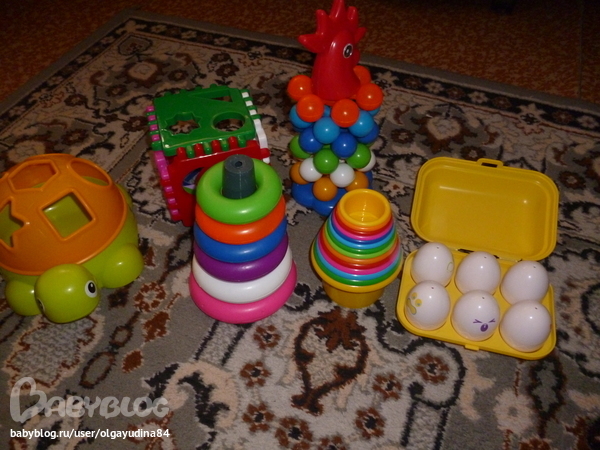 Формочки от сортера валяются везде,мы неусидчивые,поэтому хватает нас на пару формочек в сортер(с моей помощью) и пару колечек на пирамидку,понимает как это делается,но терпения не хватает,яйца томми любим вынимать,разбирать,накрывать скорлупкой,но на место ставить не получается. Стаканчики нравятся,башенку строим,но опять же надолго не хватает.