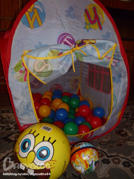 Заныреваеи в домик с разбега,очень любим его,я заглядываю в окошечко,а он прячется,смеется,в общем любим это дело.Шарики разбрасываем по всему дому,изучаем цвета по ним,а мячики тоже любим,пинаем,бегаем за ними. Хорошая вещь!