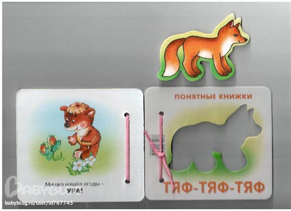 Моему зайцу было оченьинтересно смотреть на картинки животных (без лишних травки, деревьев, просто на белом фоне лисичка или волк...). Он улыбался и смотрел на меня, когда я говорила: лисичка:тяф-тяф