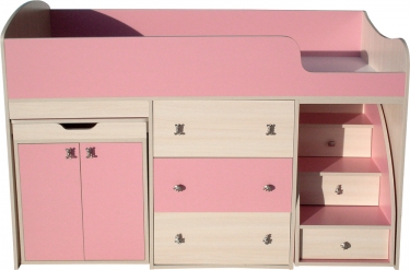 У нас такая кровать-чердак. Вместительный комод. Лесенка с тремя ящиками. Матрас надо брать до 10 сантиметров, мы взяли в икее ВИССА ВАКЕРТ, подошел идеально и по высоте и по размерам. Единственный минус бока и кроя дверей и выдвижных ящиков острые, без закругления ( каркас кровати, стол и ящик для игрушек обработан). Ручки в нас золотые Дональд Дак.
