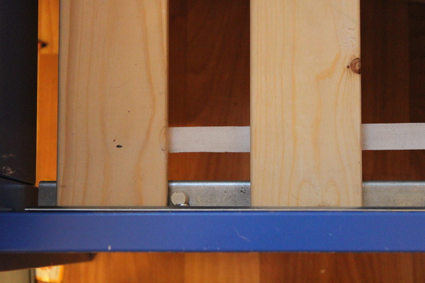 я посмотрела, у нас как раз такая, реечное дно на какой-то ленте тряпичной. но со стороны пола есть две железные палочки , которые идут крест накрест под дном, для усиления жесткости видимо. Но они не на всю длину, даже , если обрежете, их можно будет использовать.