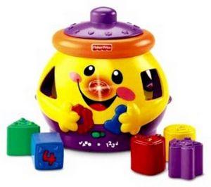У нас первый- горшочек музыкальный-сортёр, играем с 7 месяцев, скороко как год в эксплуатации. Очень хорошая игрушка, сколько раз с кровати дочка роняла всё выдержала, ни одной как говориться царапины даже, очень прочный, музыка отличная. Нам нравится!
