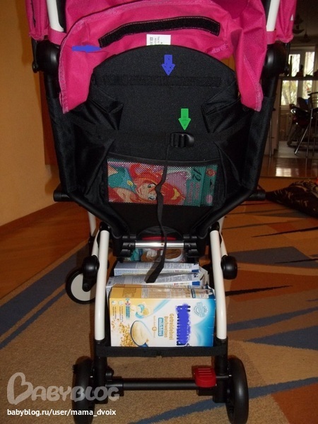 Сзади спинка регулируется с помощью ремешка (на фото ниже зеленой стрелкой), кап крепится крулыми боковыми липучками и липучкой сзади (на фото синие стрелки). В карман легко помещается стандартная пачка с 12 карандашами. но он все же немного мелковат. Ну а вместительность корзины видно по этим фото (6 пачек каш, 12 баночек пюрешек, влажные салфетки):