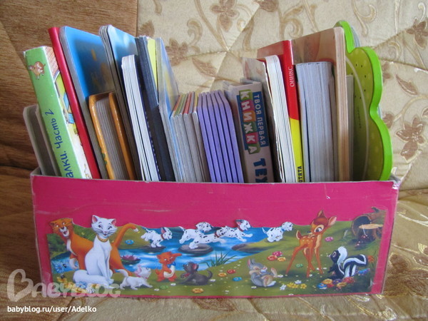 А мне очень нравится как у нас ) Я взяла обычную коробку картонную из-под обуви, крышку выкинула а в саму коробку поставила книжки, ширина книг примерно соответствует ширине коробки но это не важно просто меньше места занимать будет и книги падать не будут. В итоге и мне и ребенку очень удобно листать сверху книжки и выбирать и также вытаскивать то что нужно. Коробку можно поставить куда угодно и менять ее место хоть каждый день. Взял коробку под мышку и ничего не разваливается ! А большие иширокие книги можно или туда же скраю запихнуть или если не одна вообще рядом поставить,они же хорошо стоят ))
