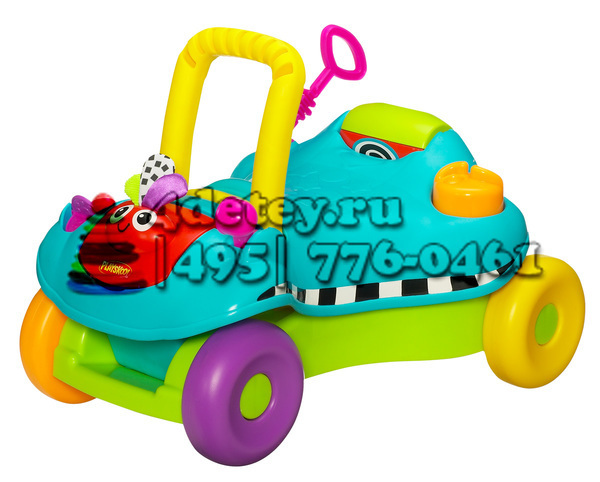 У нас плейскул, подарили ребенку на 9 мес, ему почти 2 года, а он все в нее играет)) правда как на машинке на ней не очень удобно ездить, задняя часть расширена и сын ногами об нее задевает (вот толькоможет месяцев 5 назад научился ездить). но когда он учился ходить, было здорово